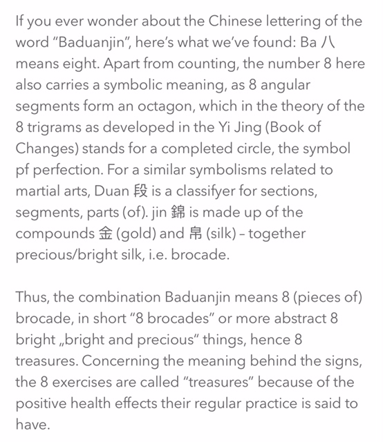 - Jin is made up of the compounds gold and silk - together precious/bright silk, i.e. brocade. Thus, the combination Baduanjin means 8 (pieces of) brocade, in short '8 brocades' or more abstract 8 bright and precious things, hence 8 treasures. Concerning the meaning behind the signs, the 8 exercises are called 'treasures' because of the positive health effects that their regular practice is said to have. They called each exercise 'Brocade' because it is believed that, after practicing the sequence, one feels like wearing a dress made of a very rich, exquisite, hard-to-find, precious, soft silk fabric. (8 Silken Movements)